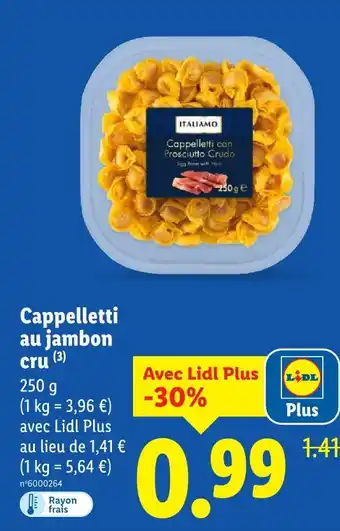 Le prix de l'offre Italiamo cappelletti au jambon cru se trouve également en haut de la page, ainsi que la date à laquelle l'offre est disponible. Vous pouvez également vérifier les prix dans le Catalogue Lidl actuel ou sur le site Internet de Lidl. Les offres vous permettent d'acheter les produits Lidl au prix le plus bas.