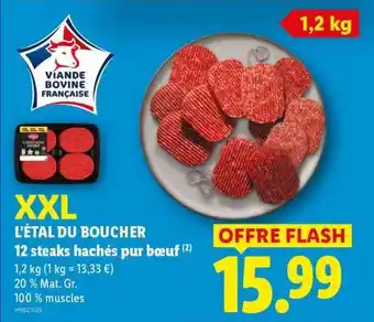 En plus de l'offre L'ÉTAL DU BOUCHER 12 steaks hachés pur bœuf, Lidl propose une large gamme de produits. Consultez le Catalogue Lidl hebdomadaire pour découvrir les meilleures offres et promotions. En plus de L'ÉTAL DU BOUCHER 12 steaks hachés pur bœuf, il y a aussi : L'ÉTAL DU BOUCHER Viande hachée pur bœuf, 4 Steaks hachés pur bœuf 15% M.G. & 8 steaks hachés pur bœuf 15 % m.g..