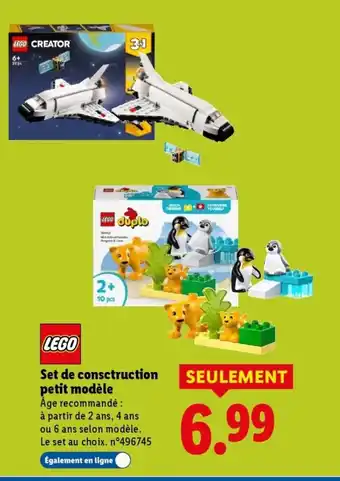 LEGO Set de consctruction petit modèle bénéficie actuellement d'une réduction chez Lidl. Vous trouverez ici toutes les infos utiles sur les prix, la durée de validité et les conditions de l’offre. Pensez à consulter aussi d'autres offres et promotions similaires pour LEGO Set de consctruction petit modèle afin d’acheter toujours au bon prix. La promo LEGO Set de consctruction petit modèle est valable du 09-03-2026 au 12-03-2026. Offre terminée ? Pas de souci. D'autres offres sur ces produits sont peut-être déjà disponibles. Vous pouvez suivre cette catégorie de produits pour rester informé en cas de nouvelle promotion LEGO Set de consctruction petit modèle chez Lidl. En comparant les offres, vous êtes sûr d’acheter au prix le plus bas possible.Questions fréquemment posées au sujet de LEGO Set de consctruction petit modèle