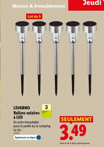 Le prix de l'offre LIVARNO Balises solaires à LED se trouve également en haut de la page, ainsi que la date à laquelle l'offre est disponible. Vous pouvez également vérifier les prix dans le Catalogue Lidl actuel ou sur le site Internet de Lidl. Les offres vous permettent d'acheter les produits Lidl au prix le plus bas.