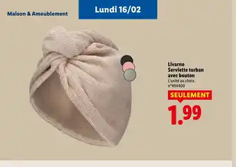 Actuellement en offre chez Lidl : LIVARNO Serviette turban avec bouton ✅ Valable du 12-02 au 18-02.