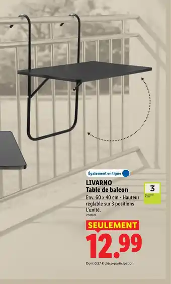 Le prix de l'offre LIVARNO Table de balcon se trouve également en haut de la page, ainsi que la date à laquelle l'offre est disponible. Vous pouvez également vérifier les prix dans le Catalogue Lidl actuel ou sur le site Internet de Lidl. Les offres vous permettent d'acheter les produits Lidl au prix le plus bas.
