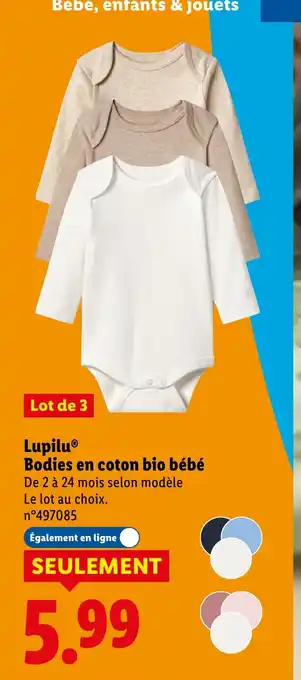 Le prix de l'offre LUPILU Bodies en coton bio bébé se trouve également en haut de la page, ainsi que la date à laquelle l'offre est disponible. Vous pouvez également vérifier les prix dans le Catalogue Lidl actuel ou sur le site Internet de Lidl. Les offres vous permettent d'acheter les produits Lidl au prix le plus bas.