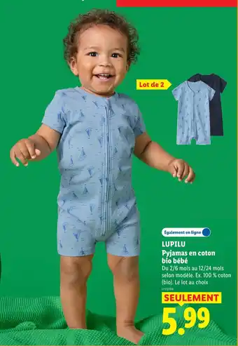Actuellement en offre chez Lidl : Lupilu pyjamas en coton bio bébé - lot de 2 ✅ Valable du 16-04 au 22-04.
