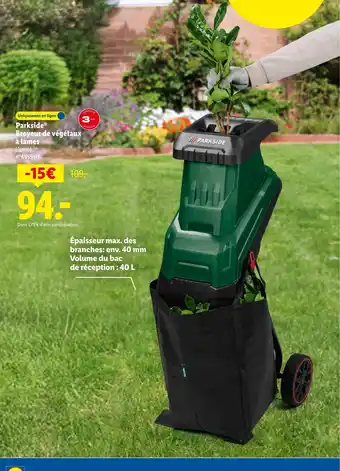 Actuellement en offre chez Lidl : PARKSIDE Broyeur de végétaux à lames ✅ Valable du 19-02 au 25-02.