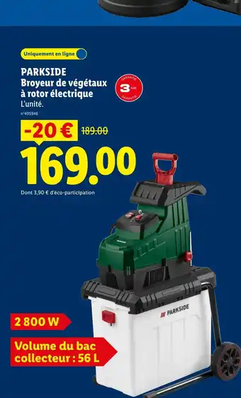 Actuellement, PARKSIDE Broyeur de végétaux à rotor électrique est en promotion chez Lidl. Toutes les informations utiles comme le prix, les conditions et la durée de validité sont affichées sur cette page. Consultez également les promotions similaires pour PARKSIDE Broyeur de végétaux à rotor électrique, afin de faire le meilleur choix. La promo PARKSIDE Broyeur de végétaux à rotor électrique est valable du 16-04-2026 au 22-04-2026. Si elle est expirée, regardez les autres offres équivalentes. Vous pouvez aussi suivre cette catégorie de produit pour être alerté lorsqu’une nouvelle promotion PARKSIDE Broyeur de végétaux à rotor électrique apparaît chez Lidl.Questions fréquemment posées au sujet de PARKSIDE Broyeur de végétaux à rotor électrique