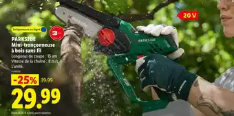 Actuellement en offre chez Lidl : Parkside mini-tronçonneuse à bois sans fil ✅ Valable du 16-04 au 22-04.