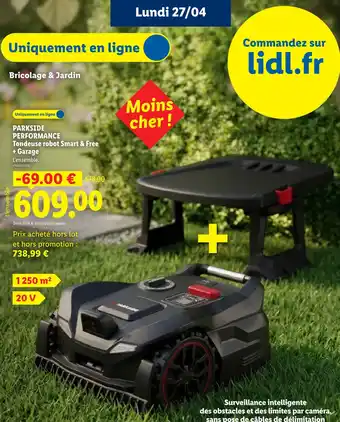 Le prix de l'offre Parkside performance tondeuse robot smart & free + garage se trouve également en haut de la page, ainsi que la date à laquelle l'offre est disponible. Vous pouvez également vérifier les prix dans le Catalogue Lidl actuel ou sur le site Internet de Lidl. Les offres vous permettent d'acheter les produits Lidl au prix le plus bas.