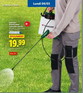 PARKSIDE Pulvérisateur à pression sans fil bénéficie actuellement d'une réduction chez Lidl. Vous trouverez ici toutes les infos utiles sur les prix, la durée de validité et les conditions de l’offre. Pensez à consulter aussi d'autres offres et promotions similaires pour PARKSIDE Pulvérisateur à pression sans fil afin d’acheter toujours au bon prix. La promo PARKSIDE Pulvérisateur à pression sans fil est valable du 09-03-2026 au 11-03-2026. Offre terminée ? Pas de souci. D'autres offres sur ces produits sont peut-être déjà disponibles. Vous pouvez suivre cette catégorie de produits pour rester informé en cas de nouvelle promotion PARKSIDE Pulvérisateur à pression sans fil chez Lidl. En comparant les offres, vous êtes sûr d’acheter au prix le plus bas possible.Questions fréquemment posées au sujet de PARKSIDE Pulvérisateur à pression sans fil