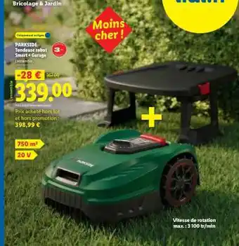 En plus de l'offre PARKSIDE Tondeuse robot Smart + Garage, Lidl propose une large gamme de produits. Consultez le Catalogue Lidl hebdomadaire pour découvrir les meilleures offres et promotions. En plus de PARKSIDE Tondeuse robot Smart + Garage, il y a aussi : PARKSIDE Tondeuse robot Smart + Garage, PARKSIDE Tondeuse robot Smart + Garage & Parkside performance tondeuse robot smart & free + garage.