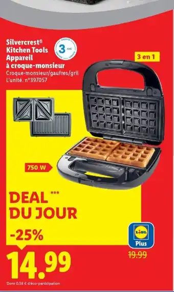 Actuellement, SILVERCREST Kitchen Tools Appareil à croque-monsieur est en promotion chez Lidl. Toutes les informations utiles comme le prix, les conditions et la durée de validité sont affichées sur cette page. Consultez également les promotions similaires pour SILVERCREST Kitchen Tools Appareil à croque-monsieur, afin de faire le meilleur choix. La promo SILVERCREST Kitchen Tools Appareil à croque-monsieur est valable du 09-03-2026 au 12-03-2026. Si elle est expirée, regardez les autres offres équivalentes. Vous pouvez aussi suivre cette catégorie de produit pour être alerté lorsqu’une nouvelle promotion SILVERCREST Kitchen Tools Appareil à croque-monsieur apparaît chez Lidl.Questions fréquemment posées au sujet de SILVERCREST Kitchen Tools Appareil à croque-monsieur