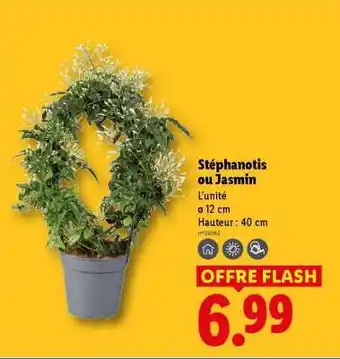 En plus de l'offre Stéphanotis ou jasmin, Lidl propose une large gamme de produits. Consultez le Catalogue Lidl hebdomadaire pour découvrir les meilleures offres et promotions. En plus de Stéphanotis ou jasmin, il y a aussi : Jasmin persistant, Jonathian jasmin & Jasmin persistant.