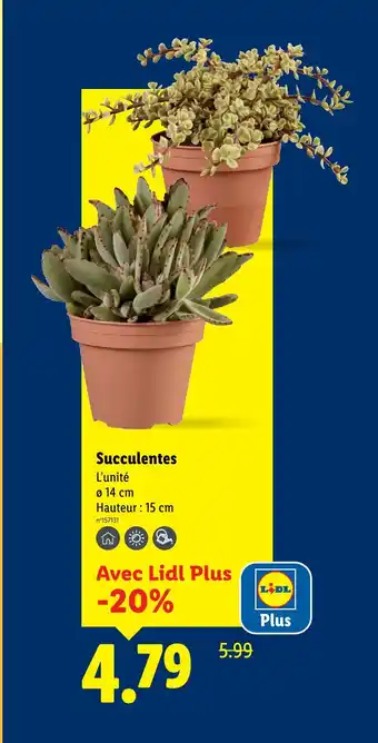 En plus de l'offre Succulentes, Lidl propose une large gamme de produits. Consultez le Catalogue Lidl hebdomadaire pour découvrir les meilleures offres et promotions. En plus de Succulentes, il y a aussi : CLOTAIRE Terreau pour cactées & succulentes, CACTUS ET SUCCULENTES MIXTE TOUFFE & offre 3.