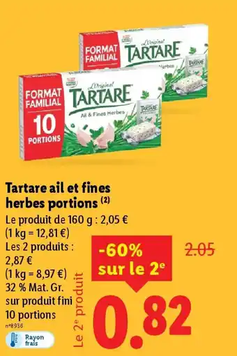 Actuellement, Tartare ail et fines herbes portions est en promotion chez Lidl. Toutes les informations utiles comme le prix, les conditions et la durée de validité sont affichées sur cette page. Consultez également les promotions similaires pour Tartare ail et fines herbes portions, afin de faire le meilleur choix. La promo Tartare ail et fines herbes portions est valable du 05-02-2026 au 11-02-2026. Si elle est expirée, regardez les autres offres équivalentes. Vous pouvez aussi suivre cette catégorie de produit pour être alerté lorsqu’une nouvelle promotion Tartare ail et fines herbes portions apparaît chez Lidl.Questions fréquemment posées au sujet de Tartare ail et fines herbes portions