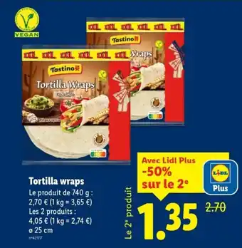 En plus de l'offre Tortilla wraps, Lidl propose une large gamme de produits. Consultez le Catalogue Lidl hebdomadaire pour découvrir les meilleures offres et promotions. En plus de Tortilla wraps, il y a aussi : Tastino tortilla wraps, Mini wraps & Carrefour - wraps de blé.