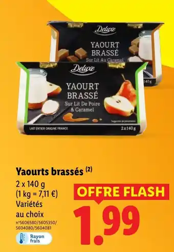 Actuellement, Yaourt brassés est en promotion chez Lidl. Toutes les informations utiles comme le prix, les conditions et la durée de validité sont affichées sur cette page. Consultez également les promotions similaires pour Yaourt brassés, afin de faire le meilleur choix. La promo Yaourt brassés est valable du 19-03-2026 au 25-03-2026. Si elle est expirée, regardez les autres offres équivalentes. Vous pouvez aussi suivre cette catégorie de produit pour être alerté lorsqu’une nouvelle promotion Yaourt brassés apparaît chez Lidl.Questions fréquemment posées au sujet de Yaourt brassés