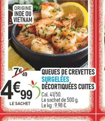 L'offre est disponible dans plusieurs magasins, vérifiez tous les produits pour obtenir le Queues de crevettes surgelees décortiquées cuites le moins cher. Si vous souhaitez savoir si l'article est en vente avec une plus grosse remise dans un autre magasin, consultez la catégorie 'Supermarché'. Ces offres pourraient aussi vous intéresser : Queues de crevettes cuites décortiquées 51 60, Queues de crevettes surgelees décortiquées crues & DELPIERRE Couronne de queues de crevettes cuites decortiquees.