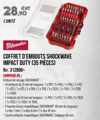 Actuellement en offre chez Master Pro : MILWAUKEE Coffret d'embouts shockwave impact duty (35 pièces) ✅ Valable du 10-09 au 31-12.