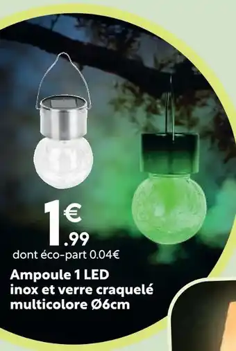 Actuellement en offre chez Maxi Bazar : Ampoule 1 led inox et verre craquelé multicolore ø6cm ✅ Valable du 1-04 au 26-04.