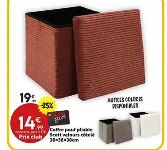 En plus de l'offre Coffre pouf pliable Scott velours côtelé, Maxi Bazar propose une large gamme de produits. Consultez le Catalogue Maxi Bazar hebdomadaire pour découvrir les meilleures offres et promotions. En plus de Coffre pouf pliable Scott velours côtelé, il y a aussi : Coffre banc pliable Scott velours côtelé, Pouf scott velours côtelé tressé & Scott - pouf velours côtél.