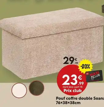 Actuellement en offre chez Maxi Bazar : Pouf coffre double soana 76×38×38cm ✅ Valable du 26-12 au 25-01.