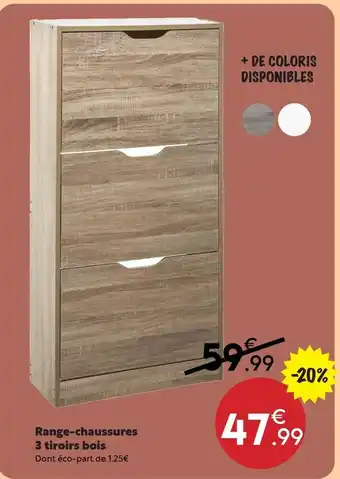 Actuellement en offre chez Maxi Bazar : Range-chaussures 3 tiroirs bois ✅ Valable du 2-03 au 29-03.