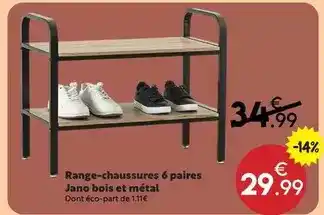 L'offre est disponible dans plusieurs magasins, vérifiez tous les produits pour obtenir le Range-chaussures 6 paires le moins cher. Si vous souhaitez savoir si l'article est en vente avec une plus grosse remise dans un autre magasin, consultez la catégorie 'Bazar et Déstockage'. Ces offres pourraient aussi vous intéresser : Range-chaussures 6 paires jano bois et métal, Banc range-chaussures Tibo & Range-chaussures 3 tiroirs bois.