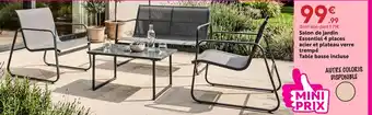 Y a-t-il une promotion sur Salon de jardin essentiel 4 places acier et plateau verre trempé table basse incluse la semaine prochaine chez Maxi Bazar ?