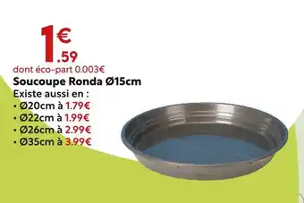 L'offre est disponible dans plusieurs magasins, vérifiez tous les produits pour obtenir le Soucoupe ronda le moins cher. Si vous souhaitez savoir si l'article est en vente avec une plus grosse remise dans un autre magasin, consultez la catégorie 'Bazar et Déstockage'. Ces offres pourraient aussi vous intéresser : Pot ronda, La soucoupe & Soucoupe ronde.