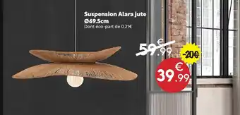 L'offre est disponible dans plusieurs magasins, vérifiez tous les produits pour obtenir le Suspension alara jute le moins cher. Si vous souhaitez savoir si l'article est en vente avec une plus grosse remise dans un autre magasin, consultez la catégorie 'Bazar et Déstockage'. Ces offres pourraient aussi vous intéresser : Suspension dôme, Suspension en métal & Suspension Mailan.