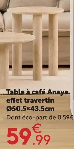 Table à café anaya effet travertin bénéficie actuellement d'une réduction chez Maxi Bazar. Vous trouverez ici toutes les infos utiles sur les prix, la durée de validité et les conditions de l’offre. Pensez à consulter aussi d'autres offres et promotions similaires pour Table à café anaya effet travertin afin d’acheter toujours au bon prix. La promo Table à café anaya effet travertin est valable du 27-04-2026 au 31-05-2026. Offre terminée ? Pas de souci. D'autres offres sur ces produits sont peut-être déjà disponibles. Vous pouvez suivre cette catégorie de produits pour rester informé en cas de nouvelle promotion Table à café anaya effet travertin chez Maxi Bazar. En comparant les offres, vous êtes sûr d’acheter au prix le plus bas possible.Questions fréquemment posées au sujet de Table à café anaya effet travertin