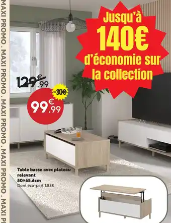 En plus de l'offre Table basse avec plateau relevant 50×65.6cm, Maxi Bazar propose une large gamme de produits. Consultez le Catalogue Maxi Bazar hebdomadaire pour découvrir les meilleures offres et promotions. En plus de Table basse avec plateau relevant 50×65.6cm, il y a aussi : Table basse Elias, Table basse Azelie & Table basse Urban.