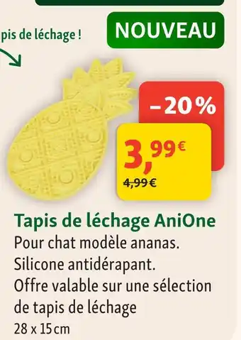Le prix de l'offre Anione tapis de léchage se trouve également en haut de la page, ainsi que la date à laquelle l'offre est disponible. Vous pouvez également vérifier les prix dans le Catalogue Maxi Zoo actuel ou sur le site Internet de Maxi Zoo. Les offres vous permettent d'acheter les produits Maxi Zoo au prix le plus bas.