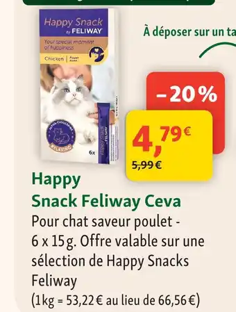 L'offre est disponible dans plusieurs magasins, vérifiez tous les produits pour obtenir le Feliway happy snack le moins cher. Si vous souhaitez savoir si l'article est en vente avec une plus grosse remise dans un autre magasin, consultez la catégorie 'Jardineries et Animaleries'. Ces offres pourraient aussi vous intéresser : Feliway - happy snack ceva, Hero - snack & Snack 'Hero'.