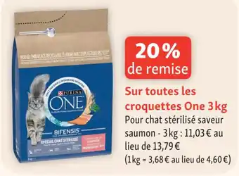 L'offre est disponible dans plusieurs magasins, vérifiez tous les produits pour obtenir le ONE Sur toutes les croquettes le moins cher. Si vous souhaitez savoir si l'article est en vente avec une plus grosse remise dans un autre magasin, consultez la catégorie 'Jardineries et Animaleries'. Ces offres pourraient aussi vous intéresser : PREMIERE Sur toutes les croquettes, ORIJEN Sur toutes les croquettes & PREMIERE Sur toutes les croquettes.