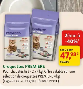 En plus de l'offre Premiere croquettes, Maxi Zoo propose une large gamme de produits. Consultez le Catalogue Maxi Zoo hebdomadaire pour découvrir les meilleures offres et promotions. En plus de Premiere croquettes, il y a aussi : Premiere croquettes best meat, Premiere alimentation & Premiere. - snacks.