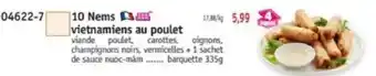 L'offre est disponible dans plusieurs magasins, vérifiez tous les produits pour obtenir le 10 nems vietnamiens au poulet le moins cher. Si vous souhaitez savoir si l'article est en vente avec une plus grosse remise dans un autre magasin, consultez la catégorie 'Supermarché'. Ces offres pourraient aussi vous intéresser : 10 nems vietnamiens aux crevettes, 10 Nems vietnamiens au porc & 10 nems vietnamiens aux crevettes.