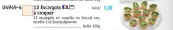 L'offre est disponible dans plusieurs magasins, vérifiez tous les produits pour obtenir le 12 escargots à croquer le moins cher. Si vous souhaitez savoir si l'article est en vente avec une plus grosse remise dans un autre magasin, consultez la catégorie 'Supermarché'. Ces offres pourraient aussi vous intéresser : Escargots au raisin, Escargots aux raisins & 48 escargots de bourgogne farcis.