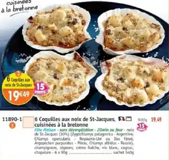 L'offre est disponible dans plusieurs magasins, vérifiez tous les produits pour obtenir le 6 Coquilles aux noix de St-Jacques, cuisinées à la bretonne le moins cher. Si vous souhaitez savoir si l'article est en vente avec une plus grosse remise dans un autre magasin, consultez la catégorie 'Supermarché'. Ces offres pourraient aussi vous intéresser : 4 coquilles aux noix de st-jacques à la bretonne, Durable - 4 coquilles st-jacques (noix 50 %), sauce bretonne & AUCHAN Coquilles saint-jacques cuisinées à la bretonne surgelées.