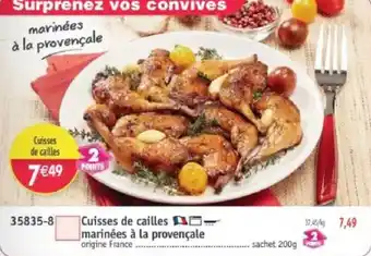 L'offre est disponible dans plusieurs magasins, vérifiez tous les produits pour obtenir le Cuisses de cailles le moins cher. Si vous souhaitez savoir si l'article est en vente avec une plus grosse remise dans un autre magasin, consultez la catégorie 'Supermarché'. Ces offres pourraient aussi vous intéresser : Cailles de vosges, 4 Cailles sans tête & Cuisses de poulet.