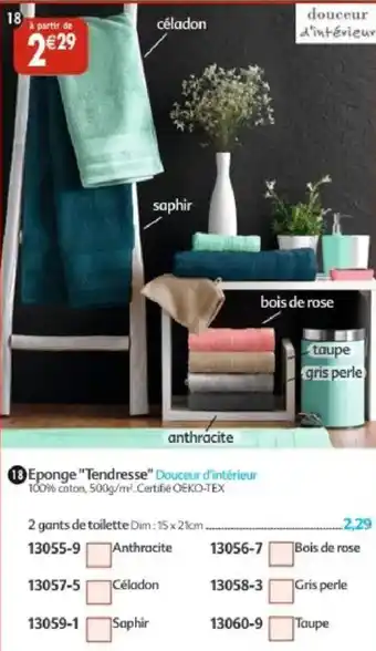 L'offre est disponible dans plusieurs magasins, vérifiez tous les produits pour obtenir le Eponge tendresse douceur d'intérieur le moins cher. Si vous souhaitez savoir si l'article est en vente avec une plus grosse remise dans un autre magasin, consultez la catégorie 'Supermarché'. Ces offres pourraient aussi vous intéresser : Tapis de bain douceur d'intérieur, Bas de porte douceur d'intérieur & Parure iris douceur d'intérieur.
