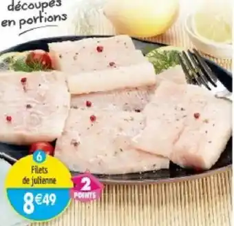 L'offre est disponible dans plusieurs magasins, vérifiez tous les produits pour obtenir le Filets de julienne découpés en portions le moins cher. Si vous souhaitez savoir si l'article est en vente avec une plus grosse remise dans un autre magasin, consultez la catégorie 'Supermarché'. Ces offres pourraient aussi vous intéresser : 2 portions de filets de colin d'alaska, Filets de cabillaud coupés en portions & Filets d'églefin coupés en portions.