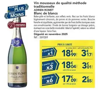 Actuellement en offre chez METRO : Brut - vin mousseux de qualité méthode traditionnelle abrien romet blanc de blancs ✅ Valable du 29-01 au 25-02.