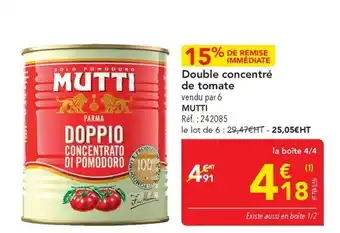 L'offre est disponible dans plusieurs magasins, vérifiez tous les produits pour obtenir le Double concentré de tomate mutti le moins cher. Si vous souhaitez savoir si l'article est en vente avec une plus grosse remise dans un autre magasin, consultez la catégorie 'Grossistes'. Ces offres pourraient aussi vous intéresser : MUTTI Sauce tomate, MUTTI Sauce Tomate & Concentré de tomate.