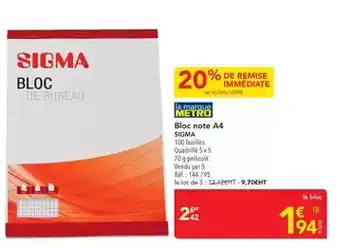 Sigma - bloc note a4 offres et promotions en ligne chez METRO