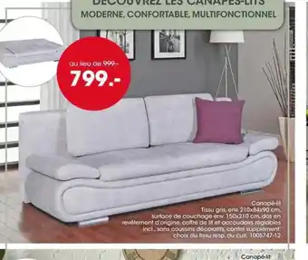 L'offre est disponible dans plusieurs magasins, vérifiez tous les produits pour obtenir le Canapé-lit Tissu gris le moins cher. Si vous souhaitez savoir si l'article est en vente avec une plus grosse remise dans un autre magasin, consultez la catégorie 'Meubles & Décoration'. Ces offres pourraient aussi vous intéresser : Canapé-lit Tissu jaune, Canapé-lit Tissu, différentes couleurs & Canapé d'angle Tissu beige.