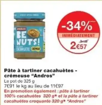 Actuellement en offre chez Monop' : ANDROS Pâte à tartiner cacahuètes - crémeuse ✅ Valable du 20-01 au 1-02.