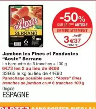 Actuellement en offre chez Monop' : AOSTE Jambon les Fines et Fondantes Serrano ✅ Valable du 16-02 au 1-03.