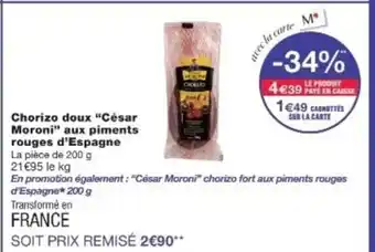 Actuellement en offre chez Monop' : CÉSAR MORONI Chorizo doux aux piments rouges d'Espagne ✅ Valable du 20-01 au 1-02.