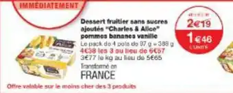 Actuellement en offre chez Monop' : Dessert fruitier sans sucres ajoutés charles & alice pommes bananes vanille ✅ Valable du 20-04 au 3-05.